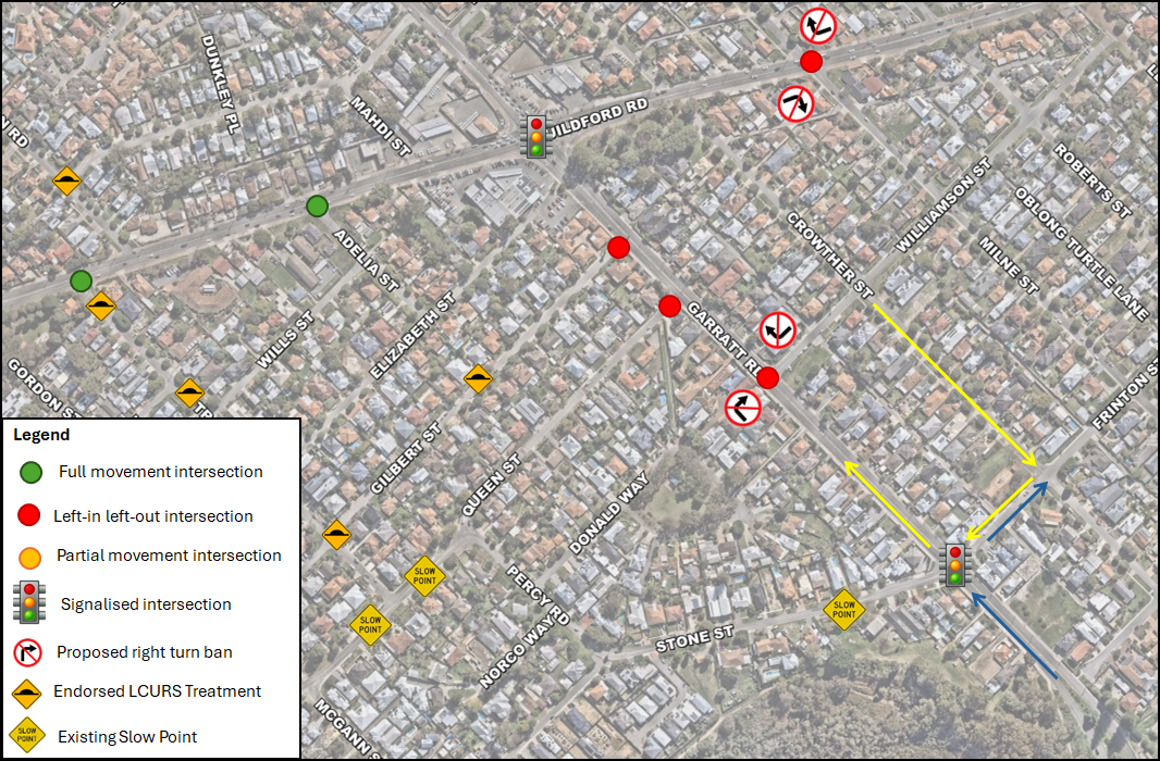 This closure was conditioned by Main Roads as part of the project upon approving the signals facility at Garratt Road and Stone Street. The closure will be undertaken and funded by Main Roads.