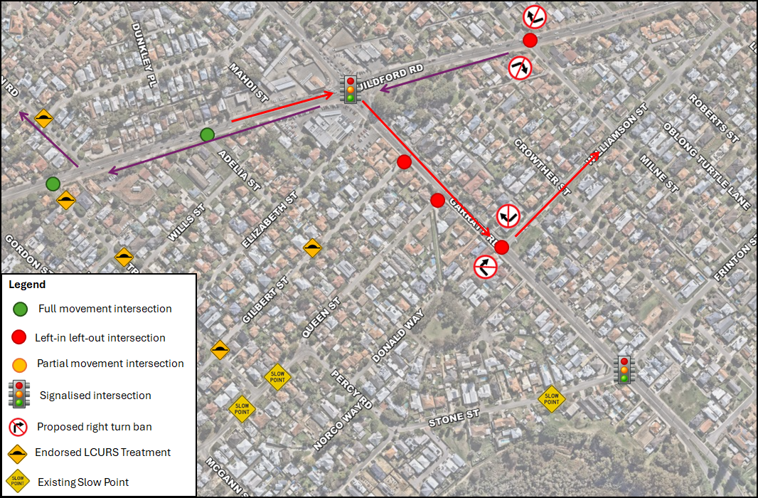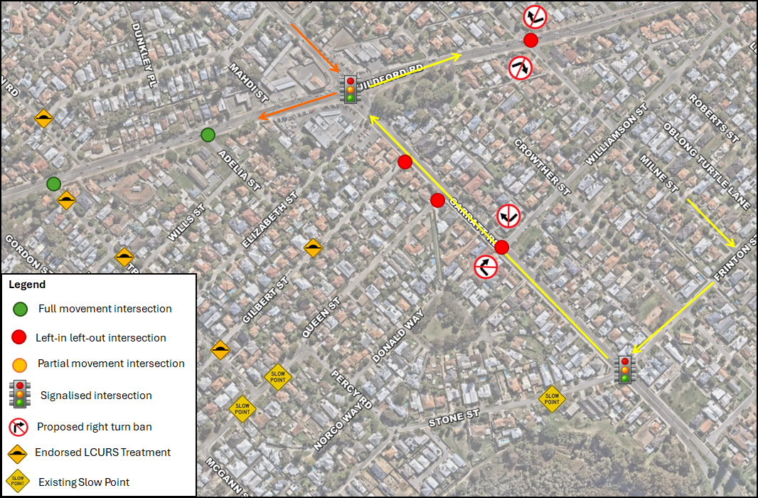 This was recommended by Main Roads at the early stages of the project to make the new proposed signals the main access to the precincts on either side of Garratt Road. This closure, however, along with the right turn closure from Milne Street, will prevent any rat running currently occurring to avoid the signals at the Guildford Road signals.