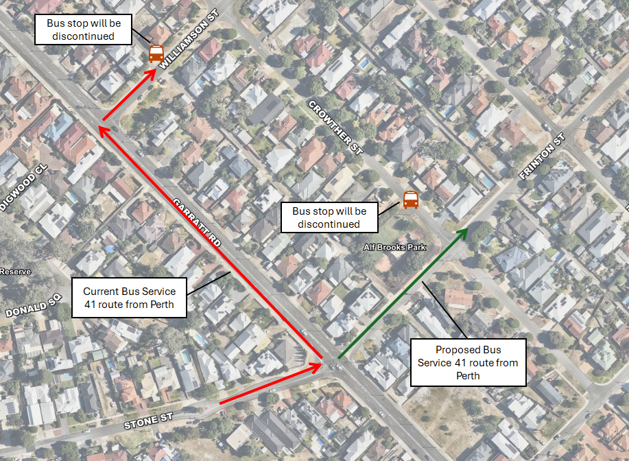 The City have liaised with the Public Transport Authority in regards to the impact to the 41 bus service, who advised they would align this service through the intersection from Stone Street to Frinton Street. This will result in the relocation of two bus stops along Williamson Street and Crowther Street.